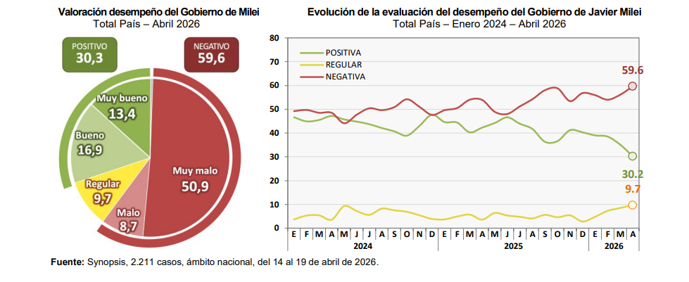 BUENOS AIRES (ANP).- La tendencia declinante de la aprobación del gobierno se profundizó durante abril y llegó a la evaluación de desempeño al peor momento de todo el ciclo. La imagen negativa volvió a subir y llegó su máximo de 59,6% mientras que la imagen positiva descendió al 30,2%, también el nivel más bajo de todo el ciclo, destacó un informe de la consultora Synopsis.