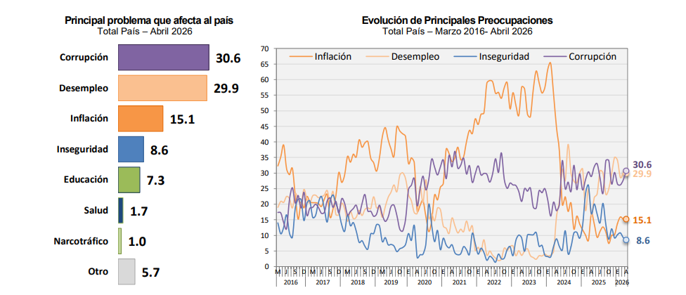 En abril lideró la Corrupción que se mantiene por encima del 30,6%, mientras que el Desempleo se muestra a menos de 1 p.p. de distancia, con el 29,9% de menciones”.